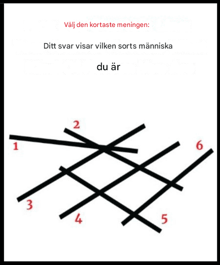 Du kan se vad bilden handlar om. Och vad sägs om det, vad sägs om det? Sex svarta linjer, numerade från 1 till 6. Men här är utmaningen: vilken tror du är kortast? Det här roliga visuala testet handlar inte bara om din syn; det är ett lekfullt sätt att fördjupa sig i din personlighet och hur du ser världen.