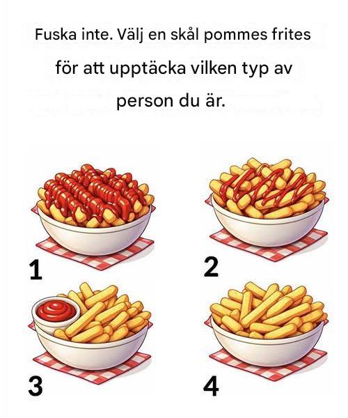 Vid första anblicken är det bara en skål pommes frites. Men val, särskilt de enklaste, avslöjar ofta subtila personlighetsdrag. Bilden utmanar dig: “Fuska inte. Välj en skål pommes frites för att upptäcka vem du egentligen är.”
