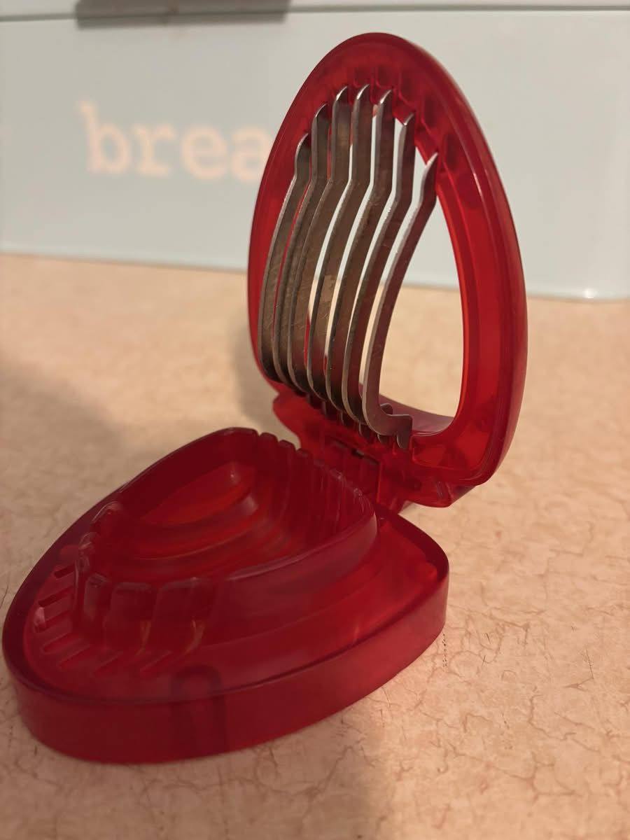 Jag hittade detta intressanta köksredskap och blev genast nyfiken på dess historia och användning. Det ser ut som ett äldre redskap, kanske från ett svenskt kök från mitten av 1900-talet eller ännu tidigare. Formen är enkel men samtidigt väldigt genomtänkt. Den röda plastbasen håller maten på plats medan flera tunna metallblad fälls ner ovanifrån för att skära i jämna delar.