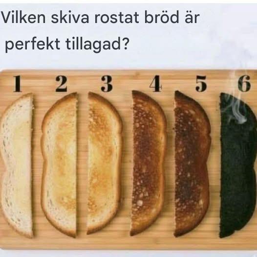 Vid första anblicken verkar bilden enkel: sex skivor rostat bröd, prydligt arrangerade och numrerade från 1 till 6, som var och en representerar en annan grad av tillagning. Skiva 1 är lätt rostad, ljus och mjuk, medan skiva 6 är helt bränd, mörk och rykande. Frågan ovanför bilden – "Vilken skiva rostat bröd är perfekt tillagad?" – verkar lekfull, men inbjuder till förvånansvärt djup reflektion.